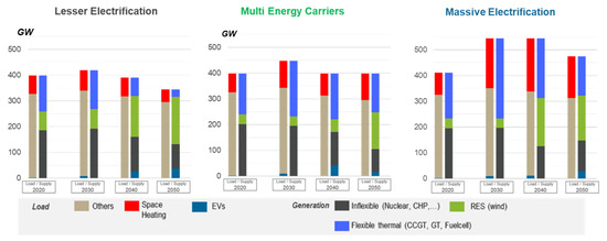 For aggregate flexible thermal capacity, their average use is lower in 2040 for LE than in the two other scenarios, where they are almost equal. A lower use in ME during this period would have been expected, as it relies more extensively on electricity and hence on a higher aggregate and more “peaky” demand. The counterintuitive result was explored in detail with the model; it is unexpected and deep. The higher electricity penetration of ME, even though directly decreasing gas demand through final consumption, indirectly increases it through the need to manage the ME peak through the production and storage of synthetic gas. The lower use of flexible thermal demand in 2050 for LE follows a different logic—it results from the limitation of imported green gas and a return to electricity close to 2050, as discussed before.