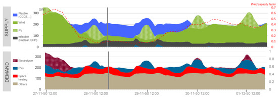 Supply and demand around the peak event in 2050 (gray bar) for the multi-energy carrier (MEC) scenario (geographical scope: AT, BE, CH, DE, FR, GB, NL).