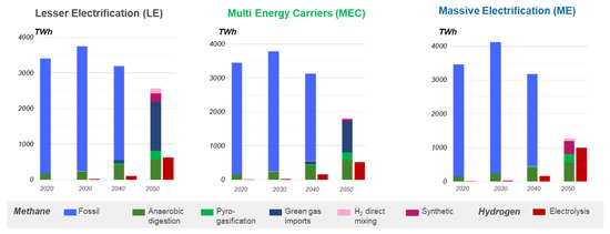 Figure 8 depicts the evolution of methane and hydrogen supply in the different scenarios. Natural gas is a transitional product that is progressively replaced by biogas (from anaerobic digestion and pyrolysis, respectively), synthetic methane (produced locally or imported), and hydrogen. These products can intervene both as substitutes to fossil fuels in demand and as fuel for the electricity supply (for example, to manage critical periods), depending on the electrification scenario (Figure 2).