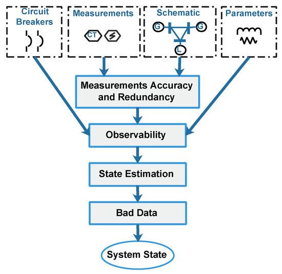 The state estimation toolbox focuses on determining the system states using the maximum available measurements from the grid. However, it requires some pre and post-processing stages, as shown in Figure 3. The pre-processing stages include observability analysis (measurements, network model and circuit breakers states), while the post-processing includes bad data detection and elimination processes [24,52,53].