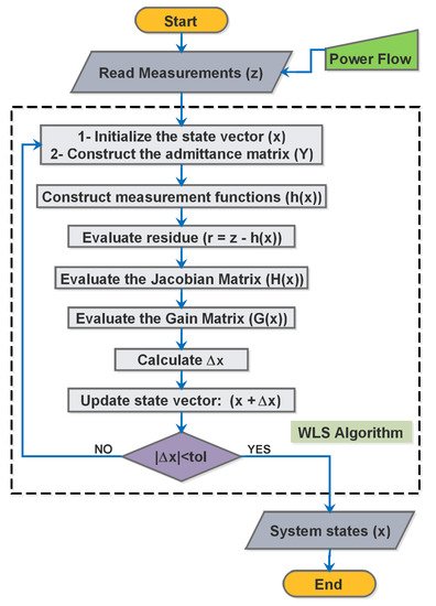 Equation (8) shows the complete formula for the system states updates ( x ^ k + 1 ). The WLS estimation algorithm steps are shown in Figure 4 flowchart.