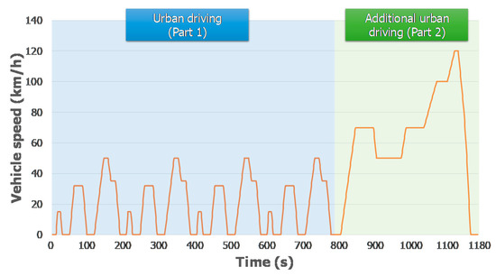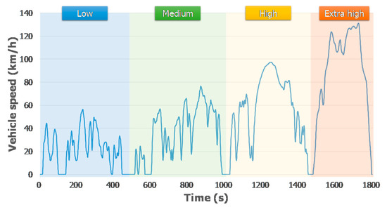 Figure 4 shows the vehicle speed profile for the time. The WLTC mode was developed by the World Forum for Harmonization of Vehicle Regulations (WP.29) in the United Nations Economic Commission for Europe (UNECE) based on the driving data obtained from different countries to overcome the problems with the NEDC mode, which failed to sufficiently reflect the real road driving characteristics. The characteristics of the WLTC mode, which are different from those of the NEDC mode, include longer driving distance, less idle time, and a higher frequency of occurrence of acceleration and deceleration, which are found during real road driving. The WLTC test cycles are classified according to the maximum speed of the test vehicle and its rated power (PMR) relative to its curb mass, including the weight of a driver equivalent to 75 kg. A comparison of the NEDC and WLTC test modes is presented in Table 7.
