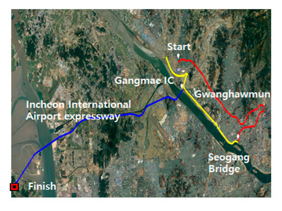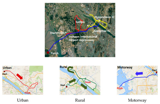 The routes for hot-start driving include an urban route of ~23 km from the Neunggok crossroad to the Seogang Bridge, a rural route of ~21 km from the Seogang Bridge to the Gangmae IC, and a motorway route of ~30 km from the Gangmae IC to the Geumsan IC. The satellite images of the test routes are shown in Figure 6.