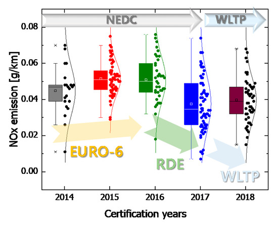 The standards for permissible levels of emissions from light-duty diesel vehicles were adopted in 2014 in Korea, and diesel vehicles certified to satisfy the Euro 6 standards are being sold since September 2014. In this study, the characteristics of NOx emissions, which were generated from diesel vehicles certified to comply with the Euro 6 standards, were examined based on the results of the certification tests performed on 266 vehicle models. Among the vehicle models, 62 vehicle models were certified by Korean vehicle manufacturers, accounting for 23% of the entire vehicle models certified. A total of 204 vehicle models were certified by foreign vehicle manufacturers before being imported to Korea. The number of imported vehicle models accounted for 77% of all certified vehicles, approximately three times the number of vehicle models certified by Korean vehicle manufacturers. The test results on NOx emissions, which were obtained in certification test modes and submitted by the vehicle manufacturers for verification of certification, were analyzed in this study. Figure 7 presents the plots representing a change in the distribution of NOx emissions according to the year of certification. The result of the distribution of NOx emissions according to the certification year indicates that the amount of NOx emissions was lower than that permissible by the Euro 6 standards (i.e., 0.08 g/km), and that it was mostly between 0.04–0.07 g/km from 2014 to 2016. Lower NOx emissions were increasingly observed in the distribution after 2017, which indicates that the amount of NOx emissions constantly decreased due to the implementation of standards for RDE and the advancements in after-treatment systems. Moreover, the amount of NOx emissions in 2018 was measured in the WLTP mode. Although a direct comparison is difficult, it is estimated that the amount of NOx emissions obtained in the WLTP mode is less than that obtained in the existing NEDC mode, because the conditions of the former mode were strengthened with the application of increased driving distance and maximum speed.