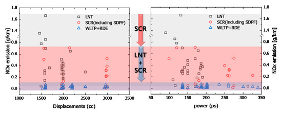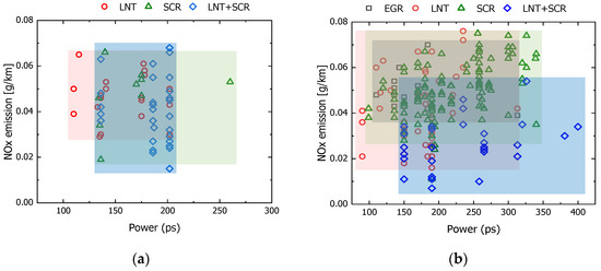 NOx emission characteristics according to after-treatment system and power for the domestic and imported vehicles in Korea. (a) Domestic vehicles; (b) Imported vehicles.