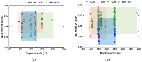 NOx emission characteristics according to after-treatment system and vehicle displacement for the domestic and imported vehicles in Korea. (a) Domestic vehicles; (b) Imported vehicles.