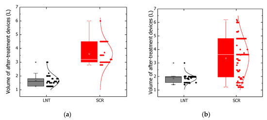 Volume distribution of after-treatment devices (LNT and SCR) in domestic and imported Euro-6 vehicles in Korea. (a) Domestic vehicles; (b) Imported vehicles.