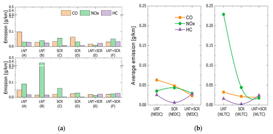 Emission characteristics of test vehicles in New European Driving Cycle (NEDC) and Worldwide Harmonized Light Vehicle Test Procedure (WLTP) modes according to the after-treatment system. (a) Measured emission values; (b) Average emission patterns.