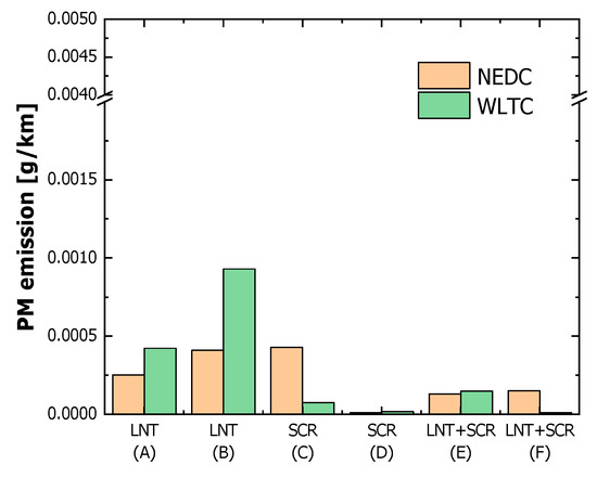 Figure 13 shows the characteristics of PM emissions generated from test vehicle models in different driving modes according to the after-treatment systems. Based on the Euro 6 standards for permissible emissions, the amount of permissible PM emissions was set as 0.0045 g/km. It was found that the amount of PM emissions generated from test vehicle models was 0.001 g/km or lower, which is lower than the permissible amount in the Euro 6 standards. This result was obtained because the DPF, which is a PM deduction system, was applied in all test vehicle models. Furthermore, a variation in tendency according to the test modes and after-treatment systems for NOx emissions was not found.