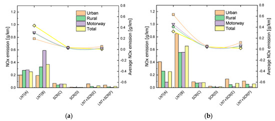 Figure 12 shows the emission characteristics according to after-treatment systems, which were obtained from the vehicle models that comply with the Euro 6 standards under the conditions of NEDC and WLTP modes. The top panel of Figure 12a shows the amount of emissions measured in the NEDC mode. This figure shows the amount of CO, NOx, and HC emissions was low, at 0.1 g/km or less. Moreover, significant changes in patterns according to after-treatment systems were not observed. However, the amount of NOx emissions generated from vehicle models equipped with the LNT system increased rapidly in the WLTP mode. This result was obtained because the emission reduction performance of the LNT system decreased because of the larger number of acceleration and deceleration sections and greater maximum speed in the WLTP mode, compared with those in the NEDC mode. Since WLTP mode has harsher conditions than NEDC mode, it is reported that regeneration of after-treatment device such as LNT occurs more frequently and NOx emissions increase [20,21]. It was reported that tin this case the fuel economy of the vehicle would also deteriorate [22]. In contrast, the amount of NOx emissions generated from vehicle models equipped with the SCR system tended to be similar or decreased in the WLTP mode [19]. It was found that changes in the amount of CO and HC emissions according to after-treatment systems or driving modes were insignificant. The graphs in Figure 12b indicate the tendency of the average amount of emissions generated from the two vehicle models according to after-treatment systems. It was found that the amount of emissions according to after-treatment systems was insignificant in the NEDC mode, and the application of both LNT and SCR systems in vehicle models resulted in better emission reduction performance. In the WLTP mode, the average amount of NOx emissions from vehicle models equipped with the LNT system was high. Contrarily, the average amount of NOx emissions from vehicle models equipped with the SCR system was low. This result indicates that the SCR system should be installed in vehicles to satisfy the WLTP standard, which is a reinforced test method. The amount of CO and HC emissions in the WLTP mode was found to be less than that in the NEDC mode, because it was affected by combustion activation due to increased temperature of exhaust gas caused by an increase in driving distance and the number of acceleration and deceleration sections.