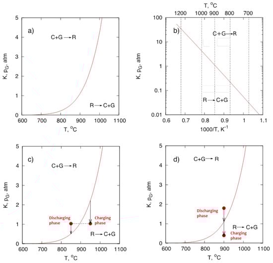 During the charging phase, the solar energy is used for the endothermic reaction to convert the solid R in solid C and gaseous product G with higher enthalpy, which are then stored separately. In the discharging phase, C and G are contacted again under suitable temperature and pressure conditions, so that the reverse reaction occurs with the release of heat. From a thermodynamic point of view, according to the phase rule, the reactive system at the equilibrium has one degree of freedom, i.e., it is possible to identify on the T-P plane a single equilibrium curve, as reported in Figure 1a,b. If the point corresponding to the temperature and partial pressure of G lies below the equilibrium curve, the endothermic decomposition of R occurs, with a driving force given by the difference and a positive heat of reaction; on the other hand, if the operating point lies above the equilibrium curve, R will be produced with a driving force given by and the release of heat of reaction. Therefore, it is possible to realize a cyclic process, alternating endothermic charging and exothermic discharging phases, either in thermal swing (Figure 1c) or pressure swing mode (Figure 1d).
