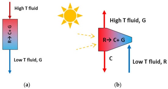 (a) Conceptual scheme of adiabatic reactor (fixed or fluidized bed); (b) Conceptual scheme of directly irradiated reactor.