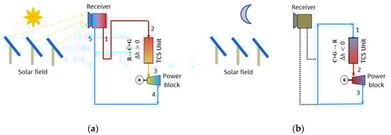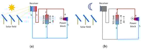 Indirect integration scheme for a central tower plant/TCS unit (oxide systems)/power block: (a) on-sun operation; (b) off-sun operation.