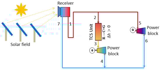 An “optimized” variant of this scheme can use different reactive materials, arranged in series and operating in complementary thermal levels, in order to make the T4 − T2 and T5 − T6 temperature ranges homogeneous. The stratification of the materials could take place in the same reactor or in separate systems, depending on the operating pressure and system requirements. Another possibility is the introduction of a latent or sensible heat storage downstream of the thermochemical accumulation to cover the whole temperature range available. Finally, an alternative integration solution consists in a combination of schemes in series and parallel, as shown in Figure 5: the alignment in series of the chemical reactor and power block can achieve similar enthalpy changes between streams 2 and 4 and streams 5 and 6, while the parallel connection between the main power block and the TCS unit can introduce a margin of flexibility in the plant operation. This implies, however, a different conversion efficiency of the two power blocks, which operate at different temperature levels.