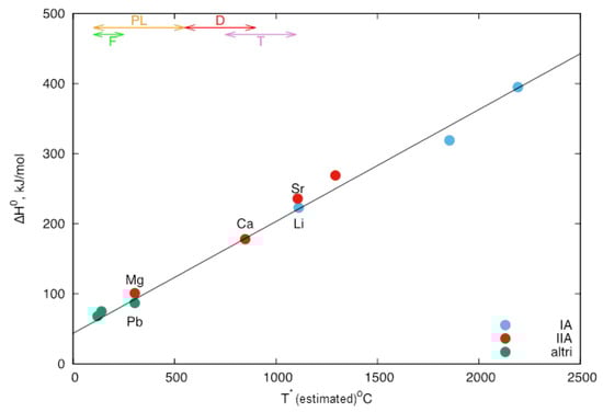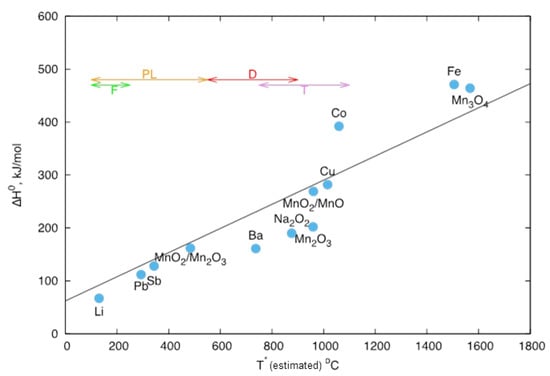 As for carbonates, thermodynamic properties for several reactive pairs are reported in Table 2, while the heat of reaction vs. the turning temperature is plotted in Figure 8. Again, an almost linear correlation is observed, corresponding to kJ/mol. The thermodynamic properties here reported have been evaluated using the data presented in [].