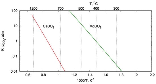 Thermodynamic equilibrium conditions for CaCO3–CO2 and MgCO3–MgO systems.