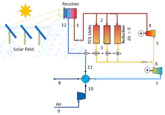 The equilibrium temperature at atmospheric pressure is high for both the systems (~900 °C); assuming the use of an adiabatic reactor in the TCS unit, this leads to a limited temperature difference between the inlet and the outlet of the thermochemical storage system (TCS unit inlet temperature: 1000 °C; TCS outlet temperature: ~900 °C). A “combined series-parallel” integration scheme was considered for both the TCS systems: the introduction of a power block in series with the thermochemical storage unit allows to fully exploit the enthalpy difference between the HTF input and the output in the solar field, while the second power unit connected in parallel allows to modulate the repartition between the stored and the directly used solar energy. In addition, in the case of metal oxides, air can be used both as heat transfer fluid and as process fluid, with no intermediate exchangers between the solar system, the thermochemical storage unit and the power block, in a compact and efficient configuration. Taking into account such boundary conditions, i.e., confined adiabatic reactor, open cycle, Brayton cycle-based power plant, and combined series/parallel configuration of the power block, the process scheme initially hypothesized for the whole system is represented in Figure 10: the atmospheric air, downstream of a compression stage, is sent to the receiver to absorb the solar radiation and transform it into thermal energy.