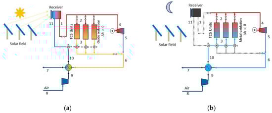 Conceptual scheme for the integration of a central tower plant with TCS storage unit assuming adiabatic reactor, closed process configuration, Brayton cycle-based power block. (a) on-sun operation; (b) off-sun operation.