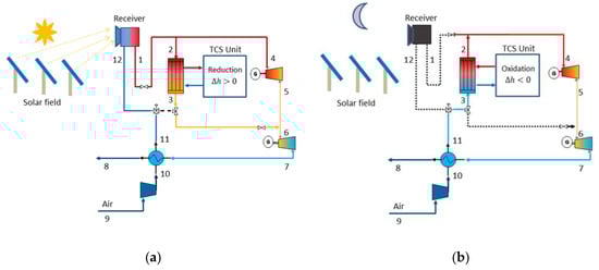 Integration scheme for a solar tower plant/TCS unit (oxide systems)/power block with expansion valves upstream of the reactor: (a) on-sun operation; (b) off-sun operation.