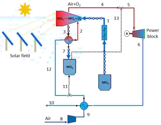 In the alternative hypothesis of employing a directly irradiated reactor, the reactive material is fed to the solar receiver through the use of specific equipment for solids handling (Figure 13). In the receiver the material is invested by the solar radiation, reacts and releases oxygen, regenerating the reduced chemical species, and is subsequently cooled and stored in a special tank. Several concepts of solid-material reactor [,], falling film reactor [], fluidized bed reactor [], swirl flow [], etc., have been proposed in the literature, but the development of this component is still at an early stage due to the technological constraints associated with the direct irradiation (resistance of materials, quartz window sealing, differential expansion, and scalability). Depending on the type of receiver adopted, the reaction can occur under vacuum or in air flow, as shown in Figure 13. In the latter case, a better internal heat transfer and a more efficient heat–electricity conversion in the power block would be obtained.