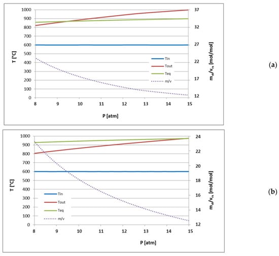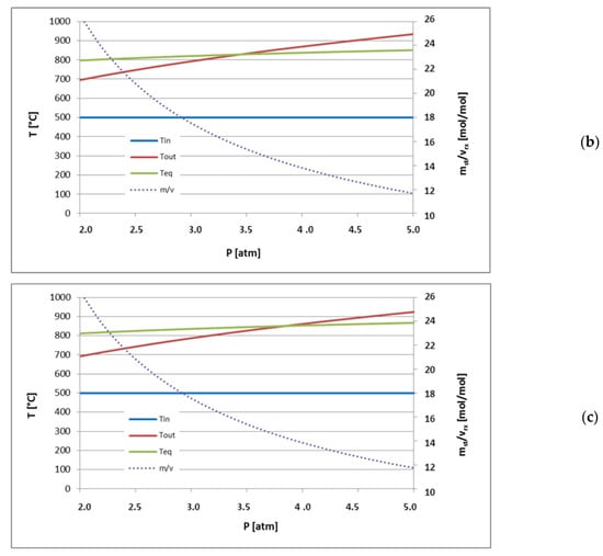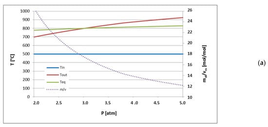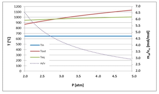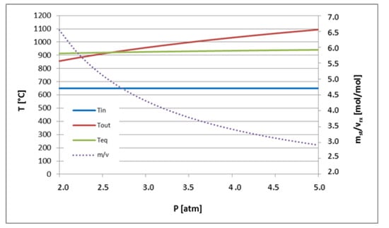 The results of the parametric analysis of the reactor operating conditions varying the compressor outlet pressure are reported in Figure 19, where the outlet temperature of the reactor is shown along with the equilibrium temperature of the reactive system and the ratio between the flow rate of the inlet gas and the reaction rate (mst/vrx).