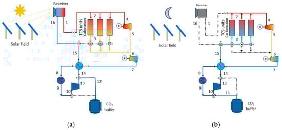 Referring to the hypothesis of a closed loop and adiabatic reactor, in the solar operating phase (Figure 16a) the stream of air and CO2 is sent to the receiver to absorb the solar energy. The hot gas leaving the receiver is partly processed directly in the power block and partly sent to the thermochemical storage unit (consisting of modular elements) to feed the endothermic calcium carbonate decomposition reaction (with CO2 release). The stream leaving the reactor is subsequently processed in a power block or, in the case of the stratified storage, sent to a second reactive step (based on magnesium carbonate) with further production of CO2. Finally, through a recuperator, the gas leaving the power block preheats the incoming air before being further cooled, compressed and stored.