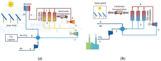 In the case of an open cycle, in the solar operating phase (Figure 18a) the atmospheric air, downstream of a compression stage, is sent to the receiver to absorb the solar radiation. The flow of hot air leaving the receiver is partly processed directly in the power block and partly sent to the thermochemical storage unit (consisting of modular elements) to power the endothermic calcium carbonate calcination reaction (with CO2 release). Finally, through a recuperator, the gas exiting the power block preheats the incoming air before being released into the atmosphere or treated in some CO2 capture and segregation process. It is worth underlining that the whole process is characterized by a neutral CO2 balance, since the carbon dioxide released during the solar operating phase has been previously absorbed by CaO, during off-sun operation, from gaseous effluents of combustion and/or oxy-combustion processes (Figure 18b).