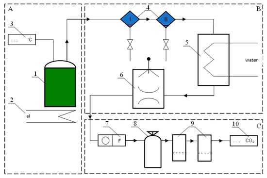Scheme of the test stand [28]: (A) chamber of reactor system with a fixed bed, (B) gas cleaning and cooling system and (C) measurement system for gas produced; (1) gasification reactor, (2) two-stage electric heater, (3) measure the temperature inside the reactor, (4) condensation tanks with drain valves (I and II), (5) condensate tank cooled by water, (6) scrubber (absorber), (7) gas meter, (8) tank, (9) double water filter and (10) exhaust gas analyzer.
