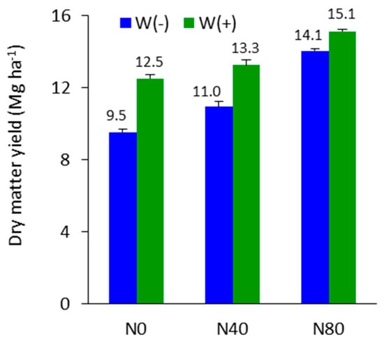 As a result of the conducted study, it was determined that cup plant dry weight yield increased with the increase in the level of fertilization and irrigation (Figure 2). Other cultivation studies have shown that irrigation increases yields by 50%, while fertilization does so by more than 25% [33]. The greatest yield, i.e., 15.12 Mg ha−1, was obtained for object W(+)/N80, and the difference between objects W(−)/N80 and W(+)/N80 was only 7.6%, testifying to the minor impact of irrigation on the dry weight yield at this fertilization dose.