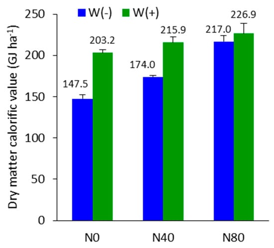 A similar relationship was observed when determining calorific values of cup plant dry weight (Figure 3), where the difference between objects W(−)/N80 and W(+)/N80 was only 4.6%. As shown in Figure 3, the influence of increasing fertilizer dose was most pronounced for non-irrigated plants.