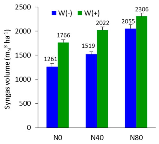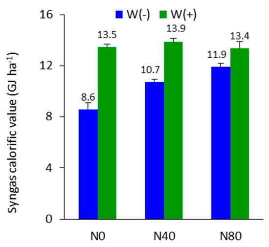 The results show that with irrigation of objects, the calorific value of obtained syngas calculated per cultivation surface unit is similar (the difference is only 3.7%) independently of the fertilization level (Figure 5). In the case of non-irrigated objects, increasing fertilization resulted in an increased calorific value: as much as 38.6%. The calorific value for one cubic meter of the obtained syngas was similar for all objects: 5.8–7.6 MJ m−3. Similar parameters are confirmed in the literature [12,34]. The calorific value depends on the syngas chemical composition. It was found that there was less carbon dioxide in syngas than in an ordinary gasifier and thus there was a higher calorific value [29].