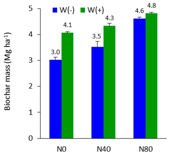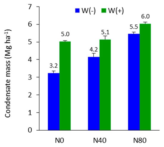 Substantial amounts of condensate were formed as a result of the gasification process (Figure 6). Converted to cultivation unit, this was an average of 4.84 Mg ha−1. It was determined that with increased fertilization and irrigation level, the amount of condensate increased by as much as 86.1% in a W(+)/N80 object in comparison with a W(−)/N0 object. A similar relationship was detected for biochar mass formed after cup plant gasification (Figure 7). However, it should be noted that the difference between W(−)/N80 and W(+)/N80 was only 4.1%, indicating the absence of any impact of irrigation on the biochar mass formed after cup plant gasification at this fertilizer dose. In this research, 32% was obtained. This was more than the average biochar content in biomass (15–20%) [35].