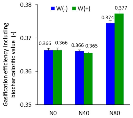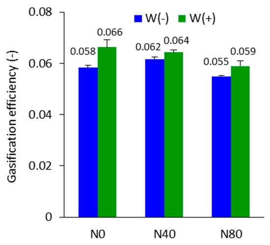 A significant parameter of the conducted process of thermochemical biomass conversion is its efficiency (Figure 8). As a result of the conducted study and calculations performed, it was determined that the efficiency of the process increased slightly after plant irrigation (13.8% for N0, 3.2% for N40 and 7.3% for N40). A reduction in the process efficiency of 10.6% was also observed for a W(+)/N80 object in comparison with a W(+)/N0 object.