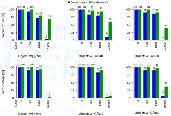 In the presented study, the number of germinating seeds was reduced in individual experimental objects in relation to the control in a range from 3–17% at the lowest dose, through 3–27% at a 10–fold dose, and up to 30–100% at the dose of 10,000 mg kg−1 DM of soil. The observed changes were significantly affected by condensate type. It is likely that the majority of tar was accumulated in tank I; thus, leachates from it exhibited a more pronounced phytotoxic effect and restricted germination to a greater degree. Leachate from gasification of cup plant cultivated without irrigation, independently of the fertilization level, resulted in an increased reduction in comparison with the leachates obtained from the gasification of plants cultivated with irrigation and fertilization. Leachates obtained from individual objects probably did not differ in the proportions of chemical substances that formed their composition. Such differences without doubt occur between tars from different biomass types [37].