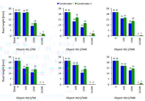 Based on the analysis of variance, it was established that condensate type, its dosage, the object and the interaction between these factors had a significant influence on Sinapsis alba germination and root elongation. With increased dosage of pollution introduced to soil, the number of germinating seeds (Figure 10), as well as root length (Figure 11), decreased. Phytotoxicity in relation to both tested parameters had also been observed in earlier experiments, which analyzed the impact of pellet gasification leachates [28].