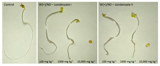 Biotests were carried out, in which the level of Sinapsis alba seed germination level (in %) and their root growth (in mm) were assessed after 3 days’ exposure to pollutants introduced to soil. In order to assess the level of contamination having a negative impact on the tested parameters, individual condensates were introduced to soil in three markedly different doses for both liquid waste from tank I, as well as tank II: 100, 1000 and 10,000 mg·kg−1 dry mass (DM) of soil. The measured condensate doses were equally distributed in the soil prepared for study and were carefully mixed. Samples were left for 24 h.