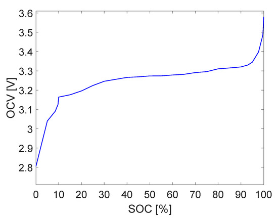 Open circuit voltage (OCV) versus state-of-charge (SOC) of the battery [26].