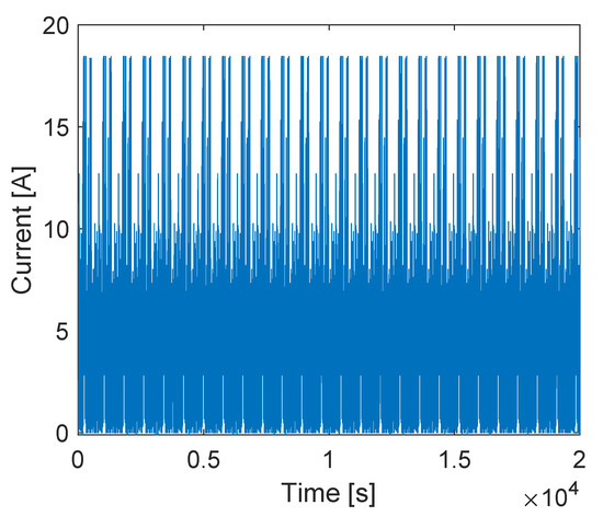 To validate the performance of the designed adaptive SRUKF with RLS-based model parameters online identification on battery SOC estimation, an IFP36130155-36Ah lithium-ion battery with a nominal capacity of [26] was chosen for the experiment. The experiment was conducted at room temperature. The mapping from the battery’s SOC to its OCV was as shown in Figure 2. The ITECH dc electronics Load IT8512 was programmed to simulate the actual working condition of the battery with the recorded signals of the current and the corresponding terminal voltage shown in Figure 3 and Figure 4, where the sampling rate is . In the RLS algorithm, the initial estimated model parameter vector was randomly selected as , and are set as and , respectively. For the proposed adaptive SRUKF algorithm, the initial estimated state vector was randomly selected as . The initial square-root state estimation covariance matrix and the initial estimated square-root covariances of the process and measurement noises were randomly set as , , and , respectively. The parameters L, , and were selected as 100, , and 2, respectively.