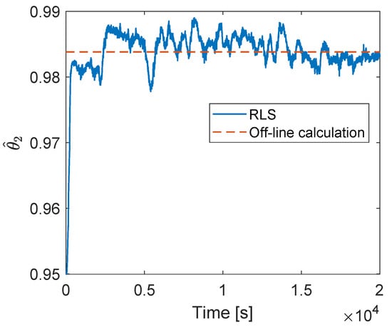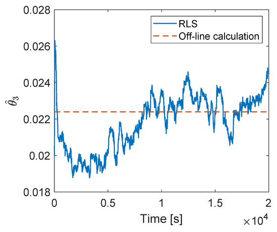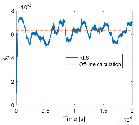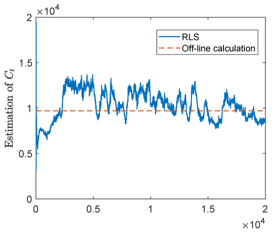The experimental results in terms of the estimated model parameters are demonstrated in Figure 5, Figure 6 and Figure 7. The corresponding estimated is shown in Figure 8. As a comparison, referring to [26], the parameter vector in the battery equivalent circuit model is calculated offline through utilizing the least-squares method with the results of .