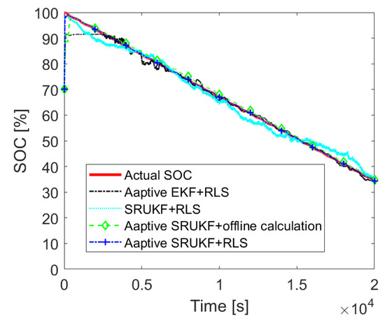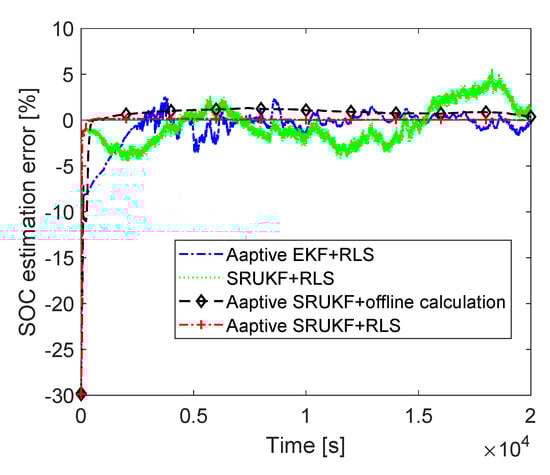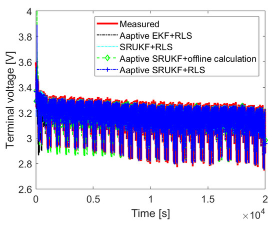 with N denoting the data number. To demonstrate the superior performance of the designed adaptive SRUKF with RLS-based model parameters online identification method, the estimation results of the SRUKF and the adaptive EKF with model parameters identified by RLS, and the adaptive SRUKF with off-line calculated model parameters are given as comparisons. The comparison of the measured and estimated terminal voltages is shown in Figure 11 and Table 1. It demonstrates that the methods with model parameters online identification can provide a smaller voltage estimation error compared with those with model parameter offline calculation. Their comparison results of the SOC estimation error are listed in Figure 10 and Table 2. It shows that higher estimation accuracy can be achieved by the proposed estimation method than other commonly used Kalman filter-based methods, which demonstrates its promising performance in terms of the SOC estimation.