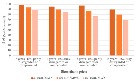 As previous studies have shown that electricity sourcing is the most determining factor of operating expenditures (OPEX) and the most economic benefit can be realized when the P2X plant is directly connected with PVs or wind turbines [35], one possible way to incite P2M investments could be to provide a framework in which P2G plants can use this surplus energy at well below market price, or if this sourcing were compensated as an acknowledged system service for flexibility or energy storage. This optimization of the price difference between the input (electricity) and the output (biomethane) on the cost side is relevant practically in ca. 1200 h per year [36] with respect to seasonal energy storage. Seasonal energy storage can be supported further on the revenue side, as biomethane FiT has been implemented in a few countries in Europe [37].