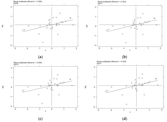 Scatter plots of Moran’s I of economic growth in China. (a) Description of scatter plots of Moran’s I of economic growth of China in 2008; (b) Description of scatter plots of Moran’s I of economic growth of China in 2011; (c) Description of scatter plots of Moran’s I of economic growth of China in 2014; (d) Description of scatter plots of Moran’s I of economic growth of China in 2017.