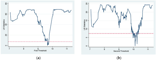 Threshold estimator and confidence interval of financial development. (a) The LR function diagram of the first threshold value; (b) The LR function diagram of the second threshold value.