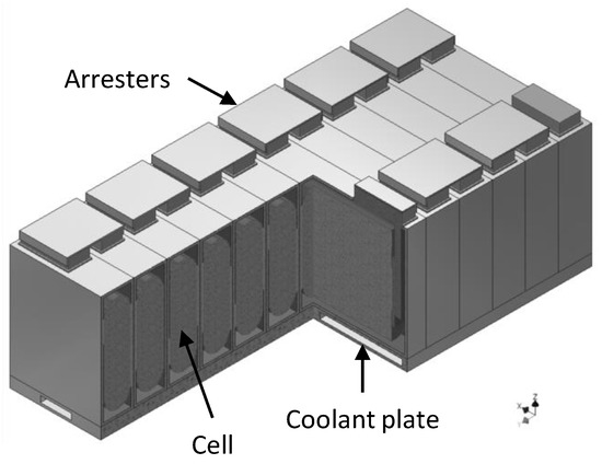 Overview of the battery module geometry. Shown are 12 prismatic cells covered in hard cases, arresters, and the coolant plate (modified from Angermeier et al. [24]).