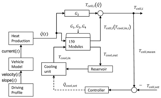 Calculation procedure for the battery system including a liquid-based thermal control loop. The driving profile and vehicle model determine the heat production. Transfer functions define the cell and coolant temperature. The coolant circulates between the battery, reservoir, and cooling unit. A controller closes the control loop considering the set and mean cell temperature.