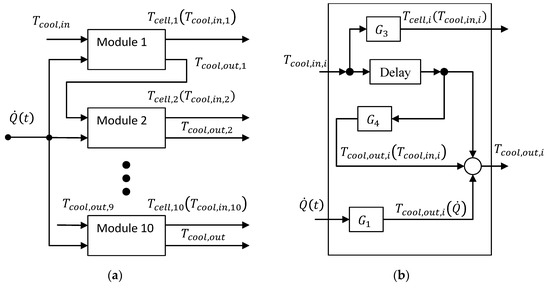 On the left side of Figure 6, the coolant connection of the modules for the first of fifteen rows is illustrated. Consequently, 10 modules are in series and 15 are in parallel connection. The total coolant flow is 2700 L/h for the system and 180 L/h per module. According to Equation (15), the coolant outlet temperature of one module is calculated in dependence of heat production and coolant inlet temperature. The relationship is clarified on the right side of Figure 6. In this case, the coolant outlet temperature of module is the inlet temperature of module . A time delay is implemented within the module to describe the time of the fluid to flow through a module.