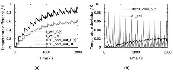 The temperature curve of the cells calculated by transfer functions covers the dynamics of the numerical results, and after 2000 s, there is a maximum deviation of 0.02 K. The coolant outlet temperature in Figure 8 represents the propagation for ten battery modules, and a maximal deviation of 0.08 K is achieved. Despite the assumption of constant temperature of the reversible heat production (Equation (6)), the results indicate the high accuracy of the calculation via transfer functions. Evidently, the validation confirms the functionality of the method to predict the heat transfer of the system. However, the method can only represent reality as precisely as the system from which the transfer functions are extracted. Therefore, the exact values from this analysis should be treated with caution regarding the simplifications and characteristics of the 3D simulation model. Nevertheless, the proposed method provides a fast and accurate calculation procedure, as the simplifications of the 3D model influence the input of the method, but not its functionality. This is especially important to emphasize, because the transfer functions (input) can also be obtained from experiments [15] or other simulations, as long as the conditions of a linear and time-invariant system are respected.