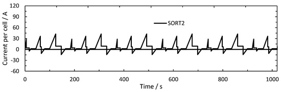 Current profile for repeated sequences of Standardized On-Road Test Cycle 2 (SORT2).