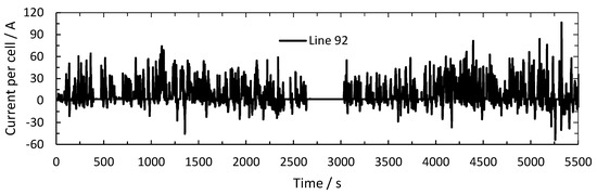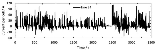 The current profiles per cell for three driving cycles are calculated according to the vehicle model of Section 2.1 and shown in Figure 9, Figure 10 and Figure 11. The lowest current rates are quantified for the urban SORT2 driving cycle, whereas the suburban bus line 84 has the highest rates. With respect to the cell capacity of 37 Ah, discharging rates up to 3 C are reached and thus comparable to the simulation results of Wu et al. [23]. However, the mean C-rate of SORT2, line 92, and line 84 are 0.23, 0.27, and 0.32, respectively. The specific energy consumption is between 1.9 and 2.3 kWh/km and hence within the range for electric buses [33,35].