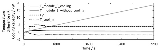 Similar results are presented in Figure 15 for two times of line 92. The total cooling time is higher compared to SORT2, and a cooling capacity of 5 kW is temporarily required during the second cycle. However, the battery cell temperature is still retained within a small range by a quasi-stationary cooling capacity control of the cooling unit. Without cooling, the temperature rises up to 17 K after 3 h and thus exceeds the recommended limit of 35 °C for an initial temperature of 25 °C. Consequently, the cooling strategy protects the battery from overheating and thus promotes lifetime and safety of the battery system.